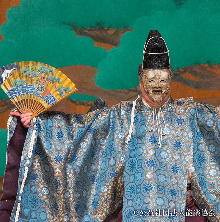 - 露払いの千歳の舞の後、五穀豊穣、天下泰平を祈る白い翁の静謐な舞。大地を踏みかため、精霊を呼び起こす黒い翁の躍動的な舞。素袍大紋、侍烏帽子で威儀を正し、舞台披きや年頭に舞われる儀式的な一曲。